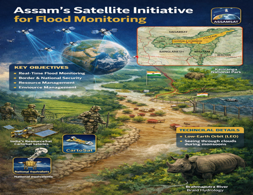 In a first-of-its-kind initiative by any Indian state, the Government of Assam has floated a tender to launch a constellation of Earth-Observation (EO) Satellites, named AssamSAT. This project aims to provide high-resolution, real-time data to tackle the state’s chronic flood issues and enhance border security.