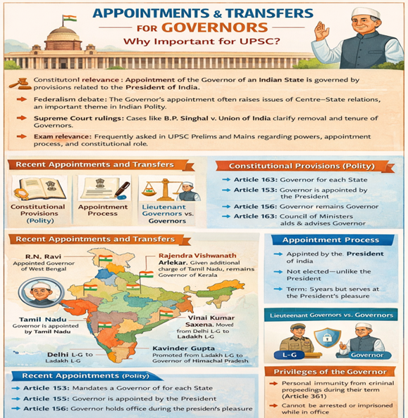 প্রেক্ষাপট (Context) ভারতের রাষ্ট্রপতি সম্প্রতি সাতটি রাজ্য এবং দুটি কেন্দ্রশাসিত অঞ্চলের জন্য নতুন রাজ্যপাল ও উপ-রাজ্যপাল (L-Gs) নিয়োগ ও বদলির ঘোষণা করেছেন। উল্লেখযোগ্য রাজনৈতিক পরিবর্তন, আসন্ন বিধানসভা নির্বাচন এবং পশ্চিমবঙ্গের রাজ্যপাল সি.ভি. আনন্দ বোসের মতো উচ্চপদস্থ কর্মকর্তাদের পদত্যাগের প্রেক্ষাপটে এই রদবদল করা হয়েছে।