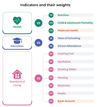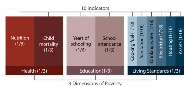 - The MPI framework assesses poverty through three key dimensions — Health, Education, and Living Standards — measured across 10 specific indicators.