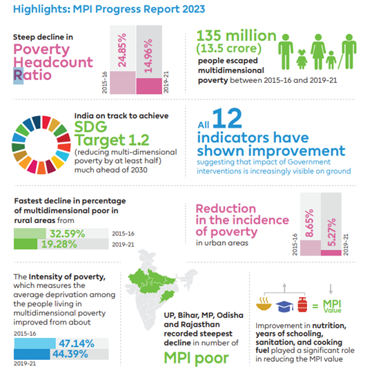 - India is on track to achieve SDG Target 1.2 (halving multidimensional poverty) well before 2030.