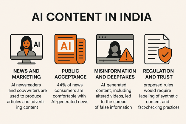 - The Existing Framework: The IT Rules, 2021, primarily focus on due diligence for online intermediaries and content takedown mechanisms. However, they lack specific provisions addressing the unique nature of AI-generated content, where the media itself is fabricated to appear authentic.