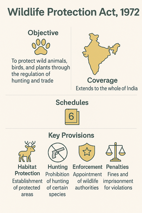 - The Wildlife (Protection) Act, 1972 is the chief statute, establishing protected areas (National Parks, Sanctuaries, Conservation Reserves, Community Reserves), imposing strict penalties for poaching, trade, and habitat destruction, and enabling the formation of bodies like the National Tiger Conservation Authority and Wildlife Crime Control Bureau.