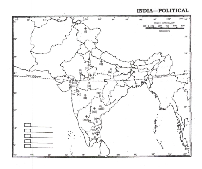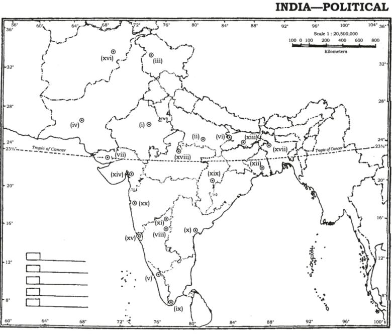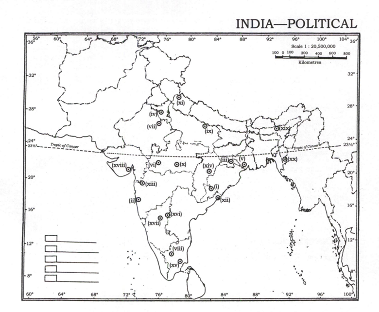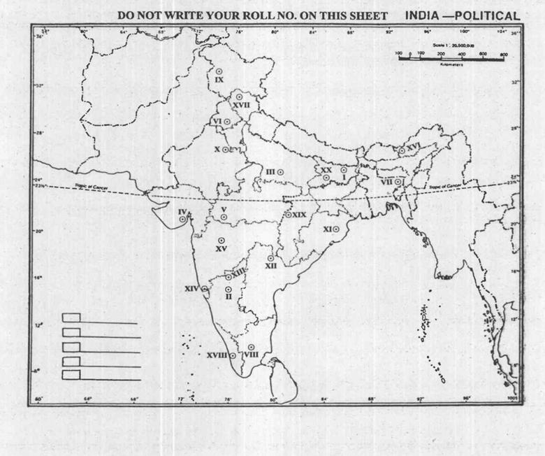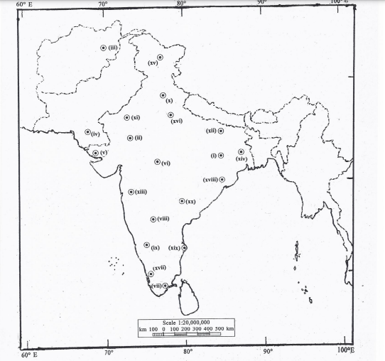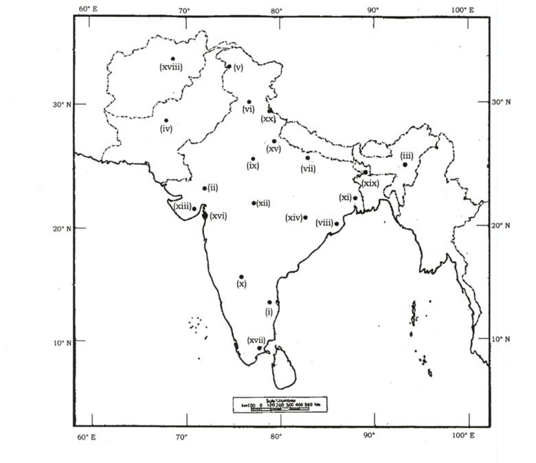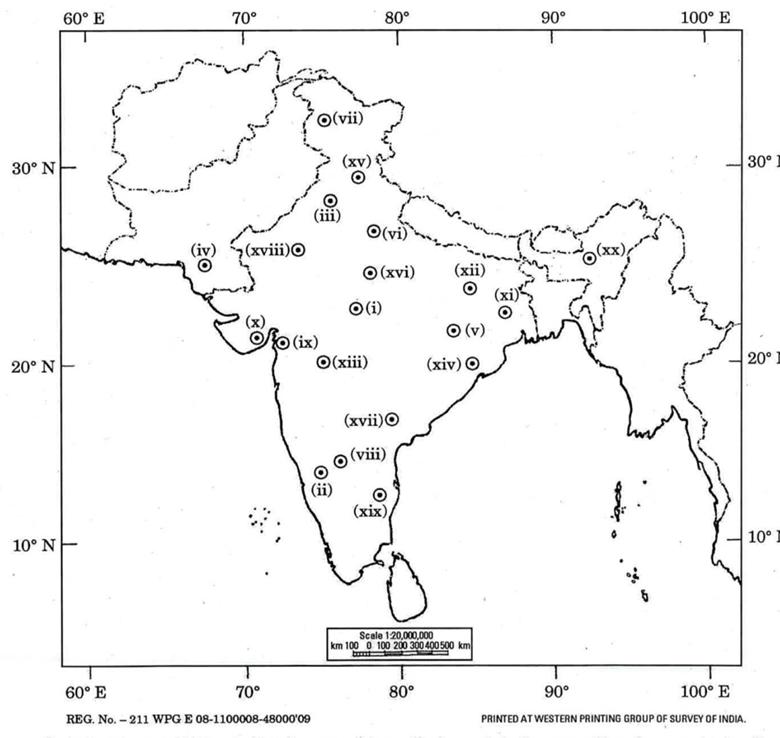 The question consists of a blind map of India with 20 numbered sites.