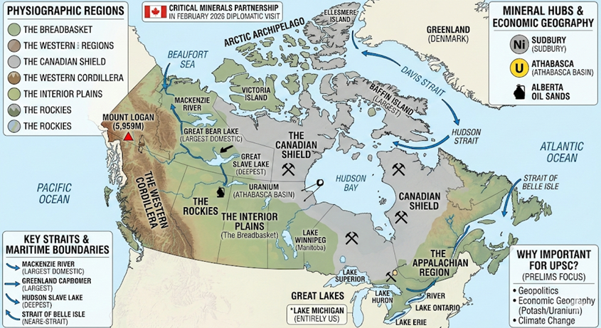 Recently, the visit of Canadian Prime Minister Mark Carney to India on February 27, 2026, has brought Canada’s geographical and strategic assets into sharp focus. A central pillar of the bilateral talks involves the India-Canada Critical Minerals Partnership. Canada’s geography is not merely a matter of topography but a repository of global resources; the Canadian Shield, often called the “Mineral House,” is vital for India’s transition to green energy, containing massive deposits of uranium, potash, and nickel.