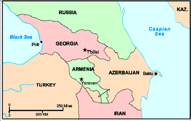 - Landforms: Greater Caucasus Mountains (North), Lesser Caucasus Mountains (South).
